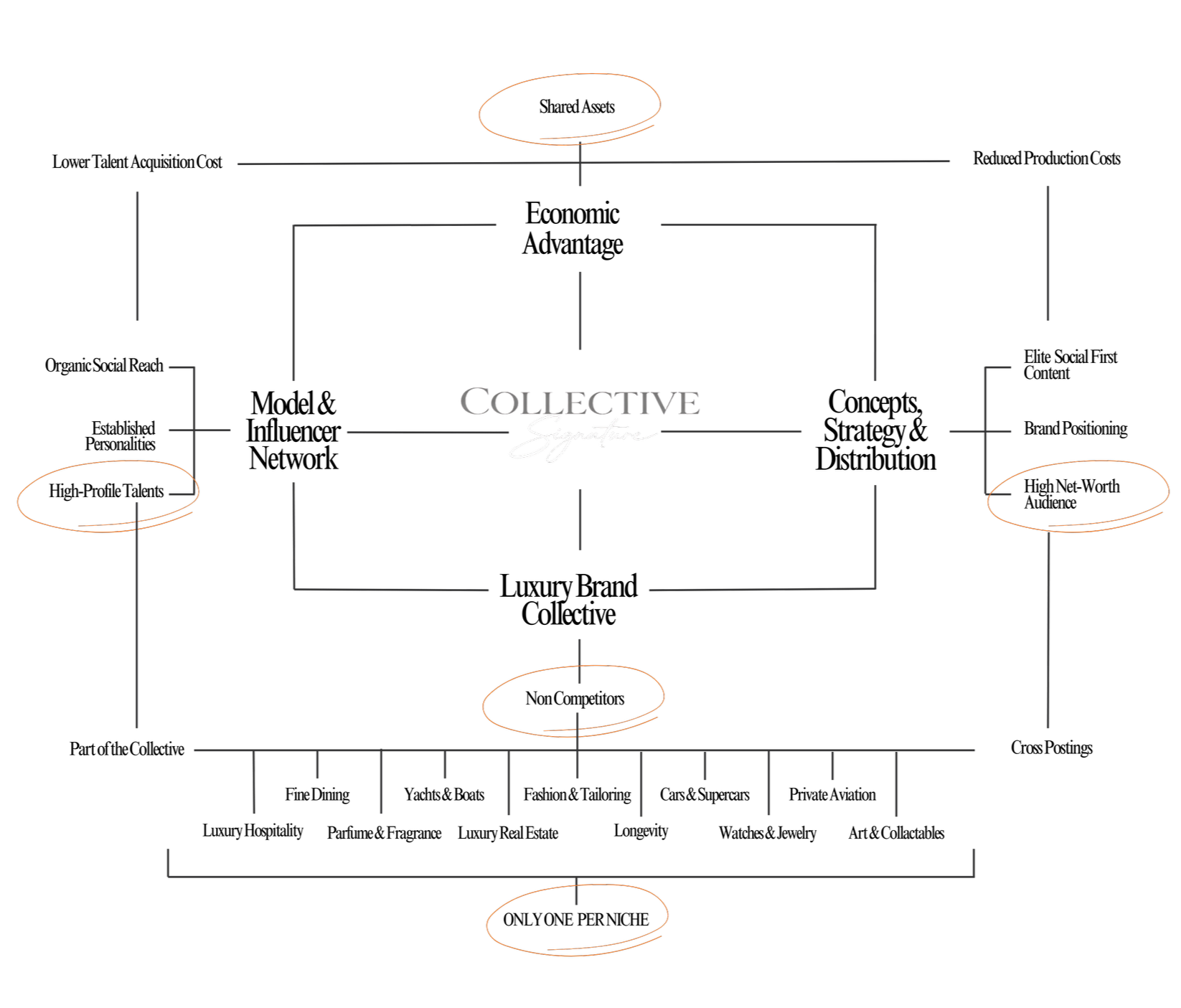 At the center of the system sits the Collective Signature luxury network, connecting high-end content production, professional models and influencers, strategic brand positioning, and non-competing luxury brands into one aligned structure.